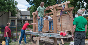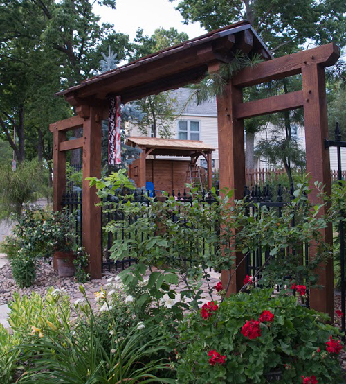 The traditional gabled-roofed garden gate or munamon /棟門 was installed in 2014 and frames the moon viewing pavilion. Both were fabricated by Phil Holtegaard of Lanesboro, Minnesota.